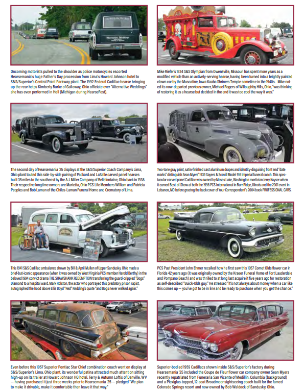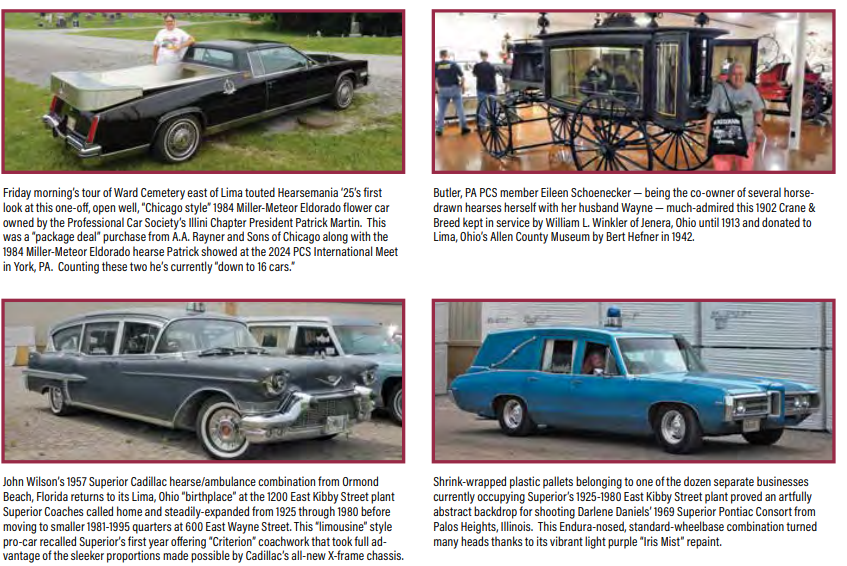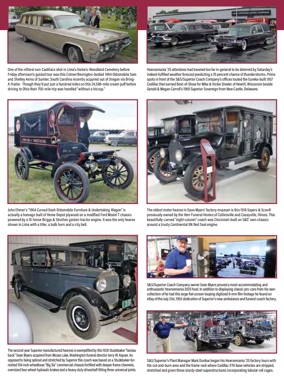 The 2025 edition “Hearsemania” held in Lima, Ohio from June 13th through 15th proved a truly epic experience that most memorably celebrated the 100th anniversary of Superior Coaches entering the hearse and ambulance building business (the company was originally founded in 1923 to manufacture bus bodies for locally-made Garford Motor Truck chassis). Five different hearse clubs officially co-hosted this de facto homecoming counting the Western Pennsylvania-based Professional Car Society Tri-State Chapter and Graveyard Mafia; the Spirit Haulers of Pittsburgh; the Cemetery Knights of Charleston, West Virginia; and the R.I.P. (Ride in Peace) Funeral & Formal Auto Society of upstate NY. Canada’s Black Widow Hearse Club was also represented by one of the banners hung from the interior balconies of the Lima Howard Johnson that served as the meet’s headquarters hotel. The fun fittingly started on Friday the 13th with tours of two historic cemeteries book-ending visits to the Allen County Museum (whose exhibits even cover the killing of Lima’s Sheriff Jess Sarber by John Dillinger’s gang during a December 12th, 1933 jailbreak) and Superior’s pre-1981 factory at 1200 East Kibby Street, after which the attendees took over S&S/Superior’s current Central Point Parkway facility for a weekend-spanning car show where plant tours were offered on Saturday. Lucky Stiff’s Post Mortem Ball served as Saturday evening’s main diversion in lieu of a staid awards banquet, turning the hotel’s central court into a lively bacchanal featuring Troupe Zephyr’s belly dancers, a creepy costume contest and a magic show where Jason Fink hung a brick from his earlobes and let audience members staple dollar bills to his stomach. In total more than 150 hearses, flower cars, limousines and ambulances from as far off as Oklahoma, Ontario, Florida and Texas took part, with this tremendous out-of town turnout augmented by all the rare and unusual pro-cars S&S/Superior owner Sean Myers has acquired with the goal of getting a company museum going. “I had to quit buying cars because I ran out of room,” our host admitted, adding he keeps another 45 cars at Southwest Professional Vehicles’ Kansas City, Kansas location. “When I bought Accubuilt eight years ago in 2017, I thought the place was void of history,” and one reason this troubled him is that the classic funeral vehicles and ambulances he so admires have enduring design features: “The extend table in my 1939 S&S Cadillac is almost identical to the one we use today — you could almost swap them out and its cathedral panels also influenced the interior design of our new Florentine flower car.”
